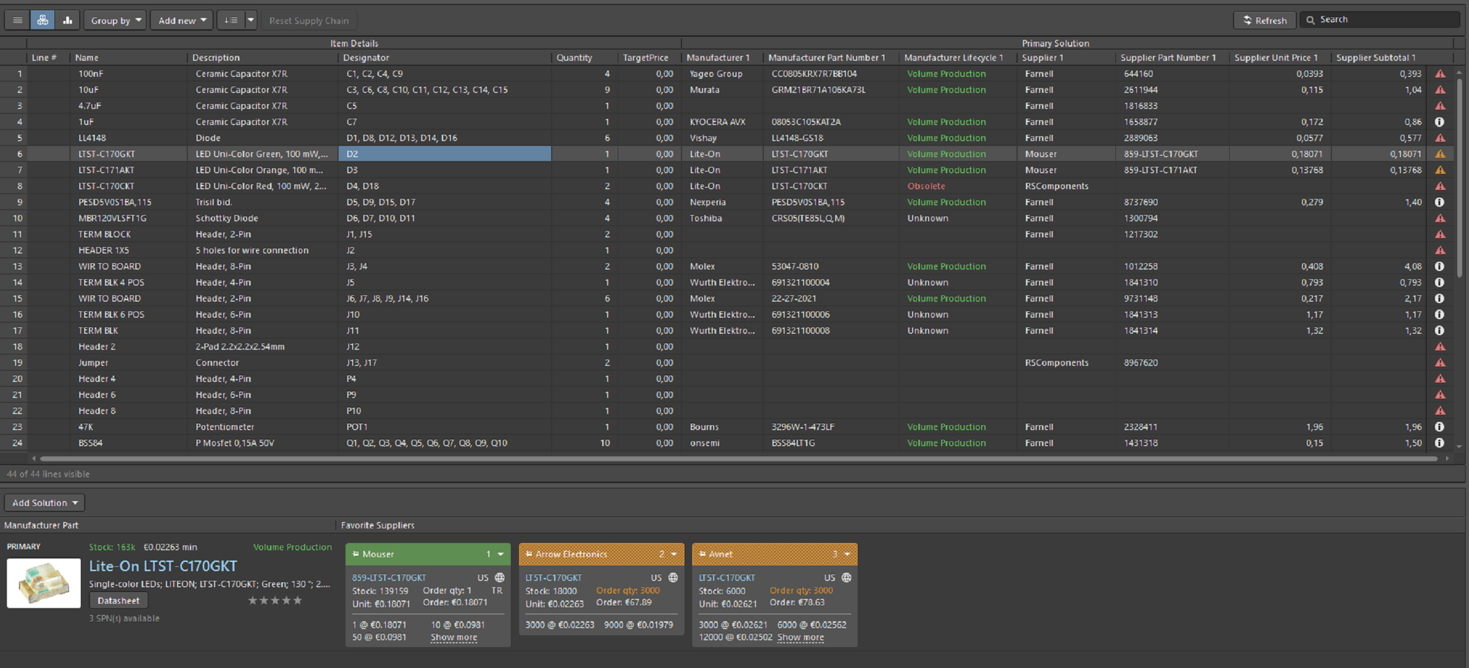 Una BOM nel design PCB è molto simile a una BOM per qualsiasi altro tipo di prodotto. È essenzialmente un elenco di componenti e informazioni sull'ordinazione dei componenti che saranno necessari per costruire un prodotto, in questo caso un'assemblaggio PCB. Il software ECAD include strumenti per estrarre i dati della catena di approvvigionamento dai tuoi componenti e generare una distinta base dai tuoi dati di design in un formato standardizzato.