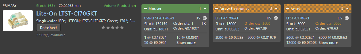 Il riquadro SPN include informazioni dettagliate sulla disponibilità del componente presso quel fornitore specifico.